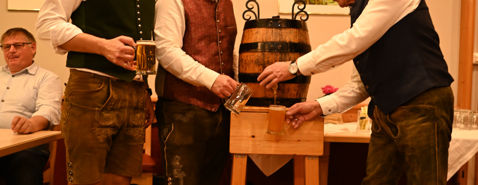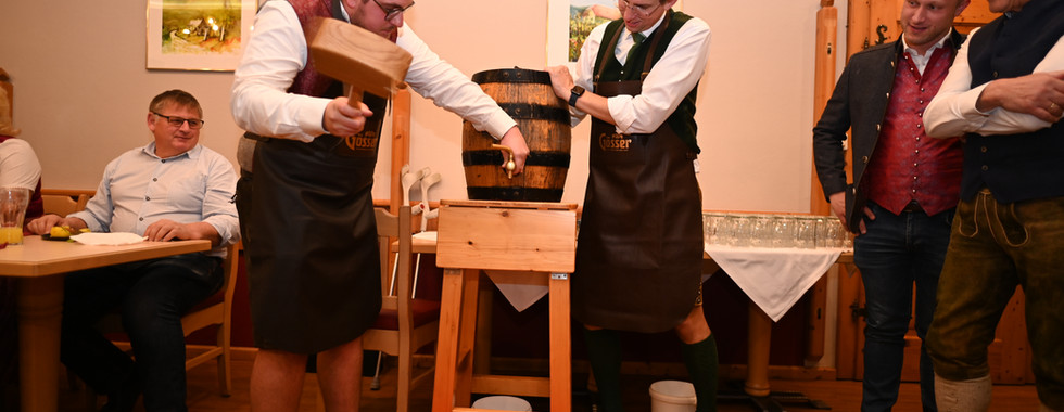 Im Anschluss folgte der bereits erwartete Bockbieranstich. Junggemeinderat Lukas Haberl setzte zwar einen perfekten Schlag, jedoch sorgte eine fehlende Dichtung für richtig viele Spritzer, bei dem einige Gläser am Saalboden verloren gingen. Der zweite Versuch gelang dann problemlos und das Bockbier konnte ausgeschenkt werden.